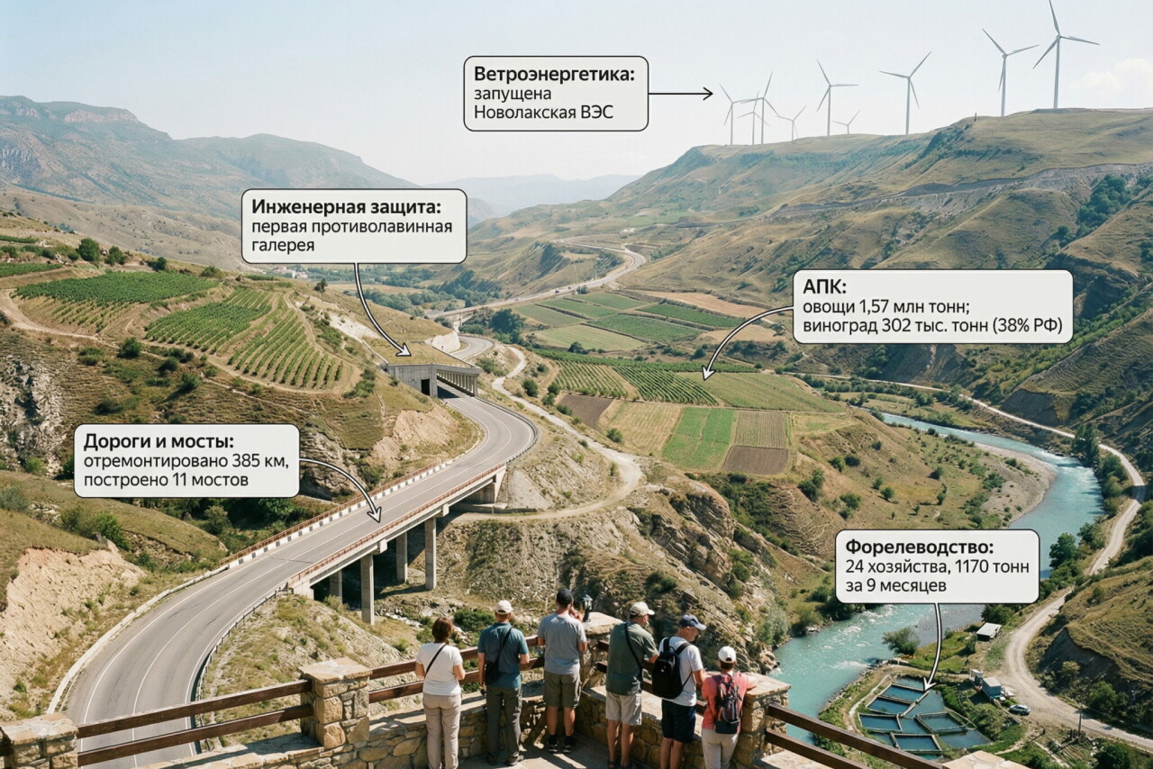 Введены в эксплуатацию 4 детских сада и открыты 14 школ. Сегодня-завтра ожидается ввод ещё одной школы и одного детского сада. Открыт логистический центр OZON, самый крупный на Северном Кавказе. Возможности маркетплейса вплотную приблизились к дагестанцам. Запущена Новолакская ветровая электростанция. К стадии запуска приблизилась также солнечная электростанция мощностью 100 МВт в Дербентском районе.