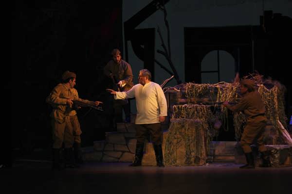 Но постепенно идиллия должна разрушиться. Весть о войне разносится по горным селениям, и хоть разрывы орудий далеко, горцы не могут отсиживаться, выжидая. Актеры театра готовятся идти на фронт. С их уходом начинается одна из самых героических страниц в истории Аварского театра. В спектакле отражена вся драматичность этого переломного момента. Мы видим, как режиссер предстает перед выбором – сохранить труппу или встать в ряды тех, кто защищает Родину. Он глубоко переживает за своих актеров и за театр, который только начинает делать первые шаги в мир искусства.