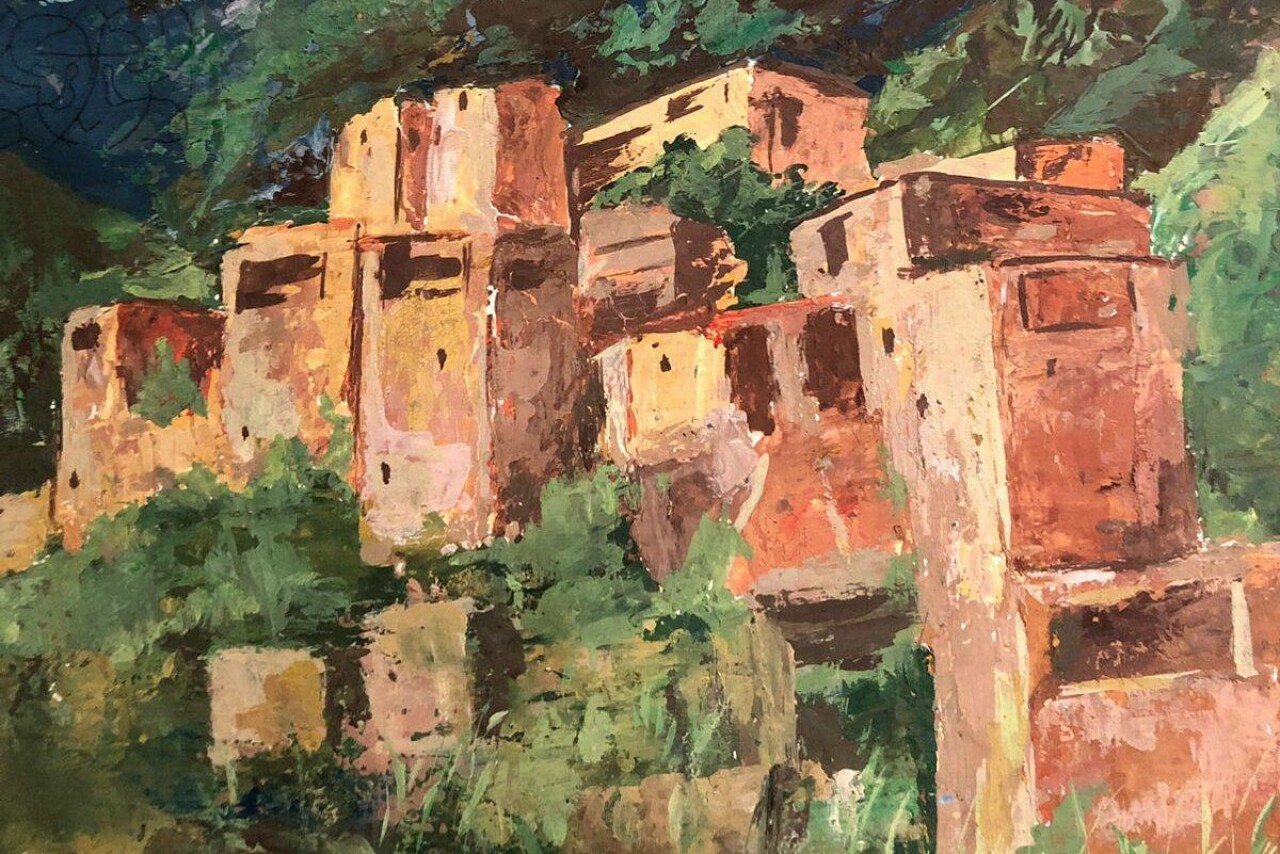 Наряду с философской способностью размышлять художник стремится к изображению привычных горских пейзажей, что пробуждает в ней понимание цвета, его тончайших оттенков, будь то гобелен или композиция, созданная с помощью акрила, гуаши, позволяющих достигать, может быть, аскетичных, но выразительных цветовых решений. Достаточно обратить взор на разрушенную башню Гоора, от которой остались небольшие фрагменты, чтобы понять взаимосвязь разрушенной смотровой башни с вечной природой, словно сохраняющей прошлое на фоне необыкновенно живописных облаков, сливающихся с горными вершинами. Заросшая травой башня – словно олицетворение горного Дагестана, на протяжении веков отражавшего набеги врага.