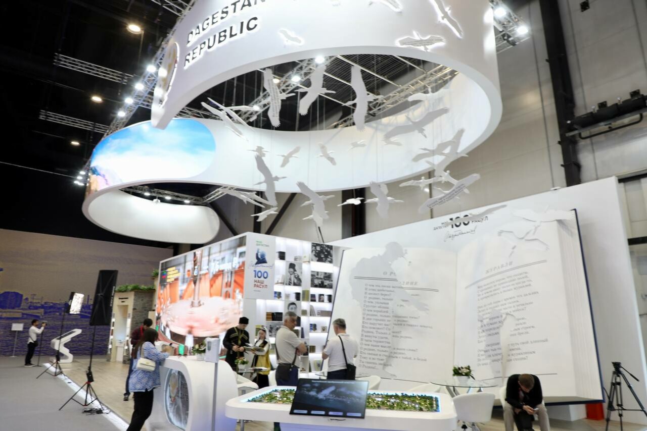 Здесь продемонстрирован экономический и культурный потенциал региона, интерактивная карта, VR-кинотеатр, переговорная зона. Отдельная часть стенда посвящена известному на весь мир дагестанскому поэту Расулу Гамзатову, чье столетие празднуют в этом году в России.