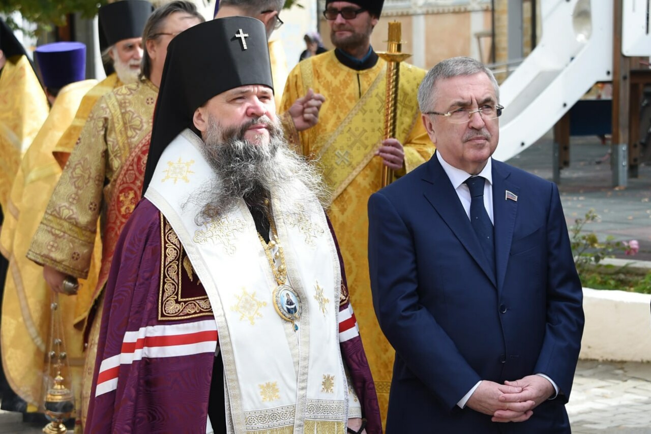 Архиепископ Махачкалинский и Дербентский Варлаам и Первый заместитель Председателя Народного Собрания Республики Дагестан Юрий Левицкий встретили в Свято-Успенском кафедральном соборе Махачкалы ковчег с частицей мощей святителя Тихона, Патриарха Московского и всея России.