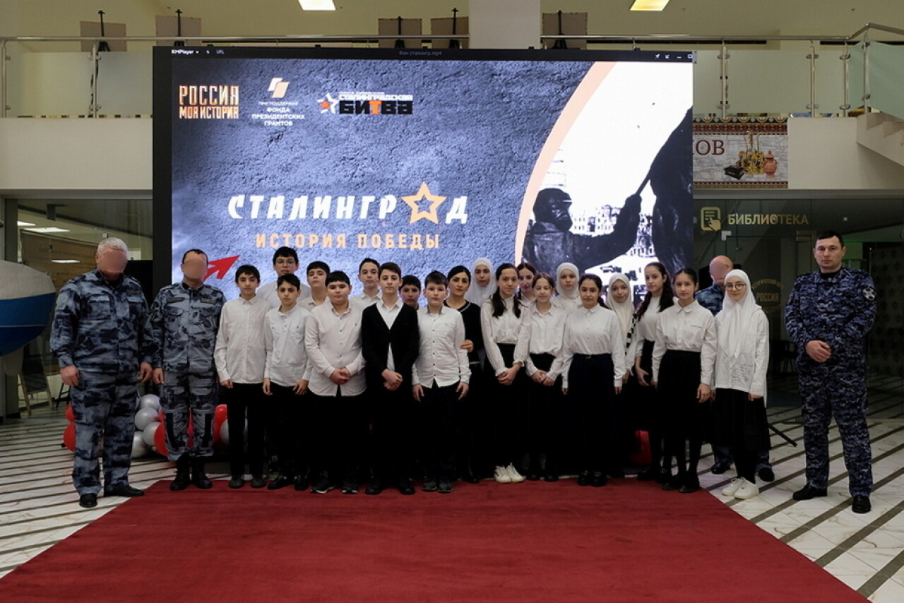 Сотрудники Росгвардии и воспитанники профильного класса после осмотра экспозиции побывали на кинопоказе, посвящённом героической защите Сталинграда.