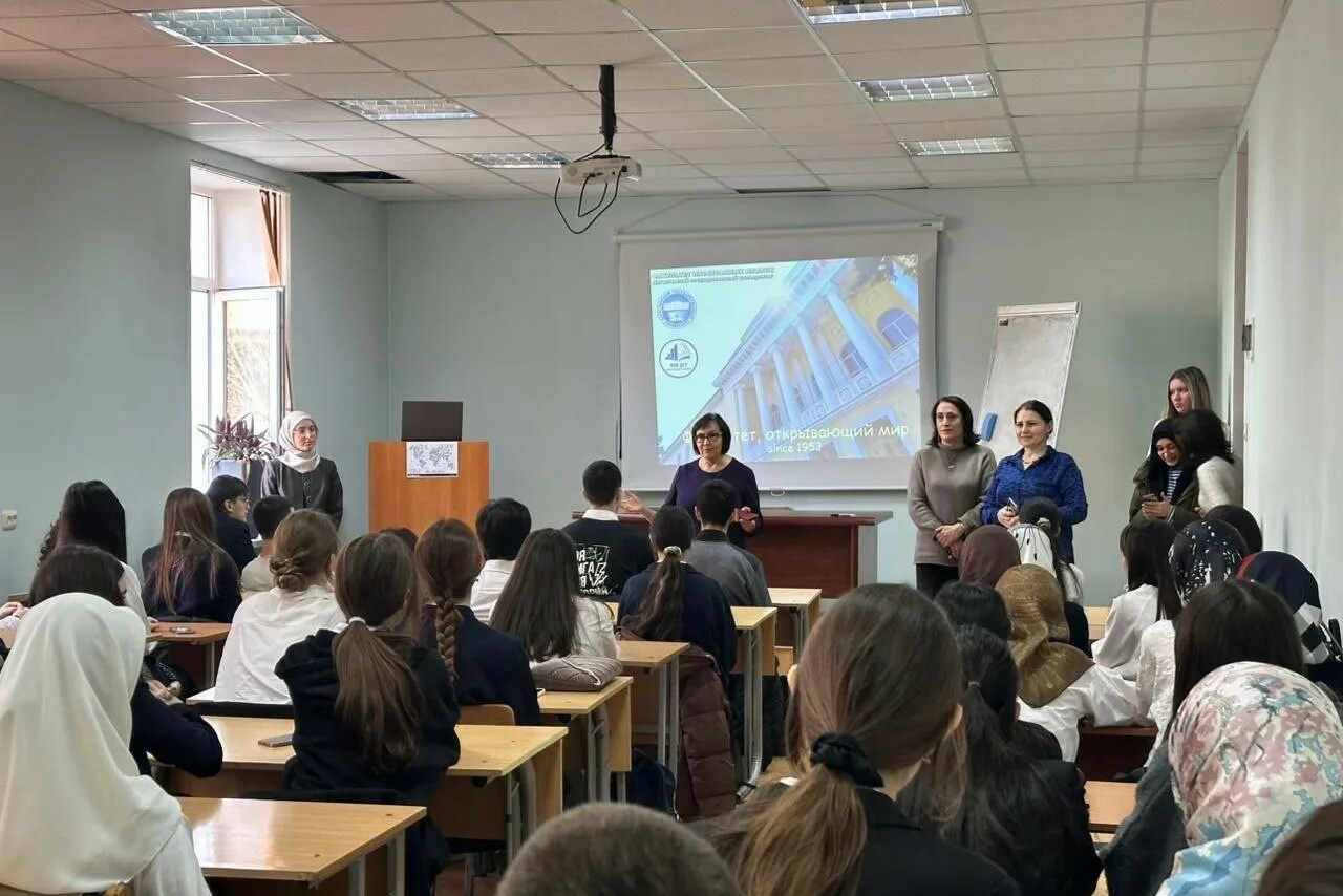 Факультет иностранных языков, ставший одним из самых востребованных по итогам приемной кампании этого года (более 1200 заявлений), принял свыше 80 учеников. Декан Татьяна Ашурбекова, заместитель декана по профориентации Патимат Омарова, а также педагоги и студенты радушно встретили гостей, представив направления обучения, условия поступления, информацию об олимпиадах и конкурсах. Студенты ФИЯ порадовали школьников ярким концертом на шести языках мира.