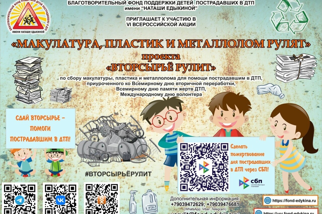 С 24 октября по 24 декабря 2025 года Благотворительный фонд поддержки детей, пострадавших в ДТП имени «Наташи Едыкиной», проводит VI Всероссийскую акцию «Макулатура, пластик и металлолом рулят». Мероприятие приурочено к Всемирному дню вторичной переработки и Всемирному дню памяти жертв ДТП.