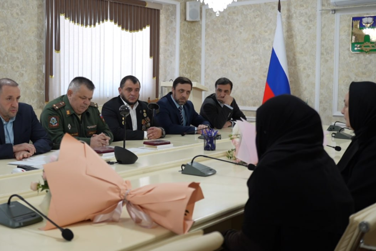 В администрации Хасавюрта прошла церемония передачи ордена Мужества и ордена Святого Георгия IV степени семье погибшего участника специальной военной операции Наби Индербиева. Ордена были вручены его матери Лианне Шамиловой и бабушке Элизе Ирбайхановой.