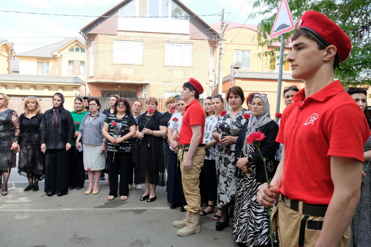 Шамиль Меджидов и брат погибшего росгвардейца Гамзат Айтемиров открыли мемориальную доску, размещенную на фасаде здания школы. Затем собравшиеся взяли участие в минуте молчания и возложили цветы к мемориальной доске.