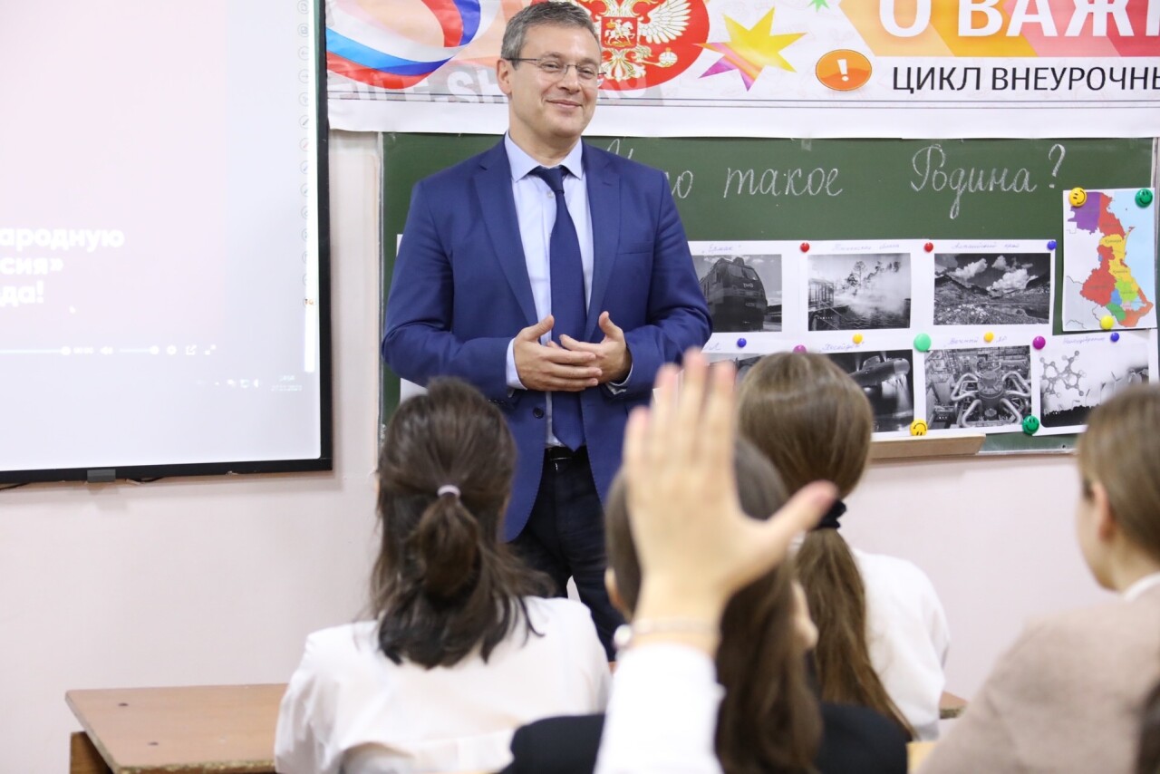 Первый заместитель Председателя Правительства Республики Дагестан Манвел Мажонц в рамках проекта «Разговоры о важном» провел открытый урок для учеников 8-х классов гимназии №13 г. Махачкалы.