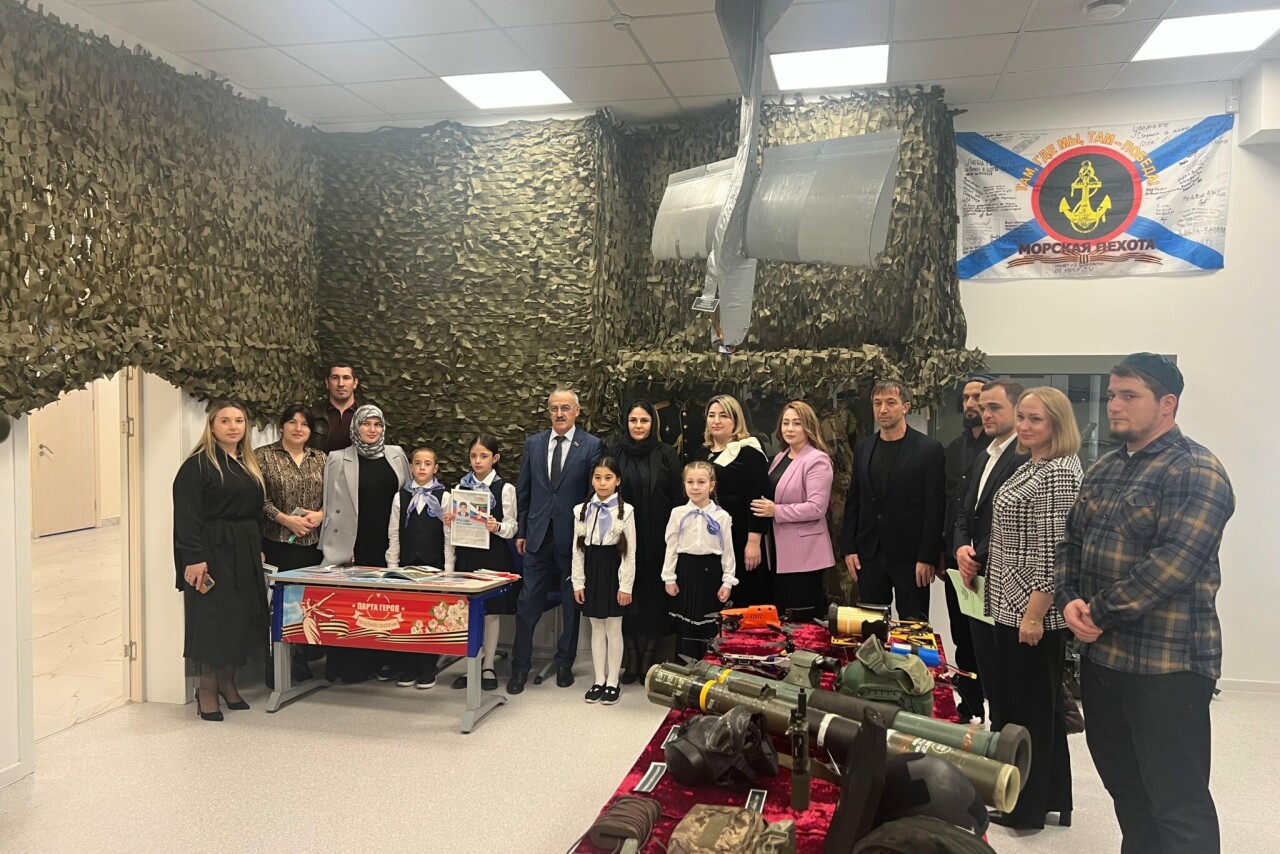 Директор школы провела для Нурбагандова экскурсию по музею, подробно рассказывая о каждом экспонате. В витринах хранятся уникальные предметы, которые помогают сохранить память о подвиге российских военнослужащих: личные вещи бойцов, элементы их экипировки, оружие, трогательные письма с фронта, фотографии и государственные награды.