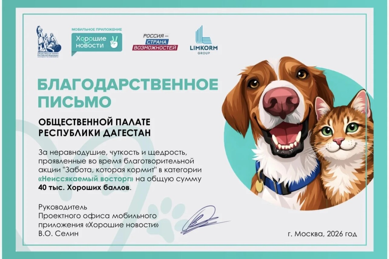 В письме выражается признательность за участие команды Общественной палаты Дагестана в благотворительной кампании «Забота, которая кормит», а также за их активную и неравнодушную поддержку в разделе «Неиссякаемый восторг», что выразилось в накоплении 40 тысяч «Хороших баллов».