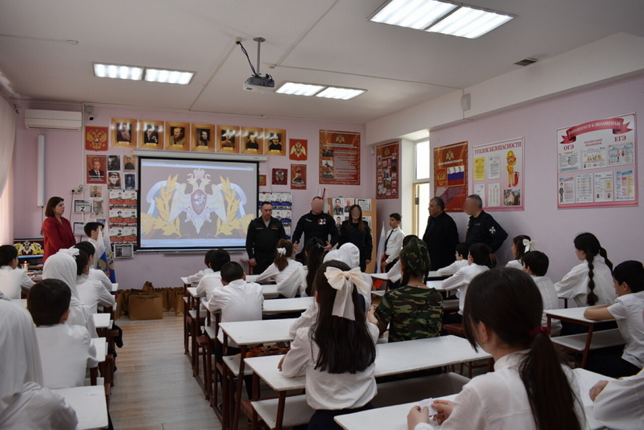 В рамках празднования 10-летия Росгвардии и 215-й годовщины образования войск правопорядка врио начальника Управления Росгвардии по Республике Дагестан полковник Вадим Курбанов встретился с учащимися профильного класса махачкалинской школы №10 им. А.П. Гайдара.
