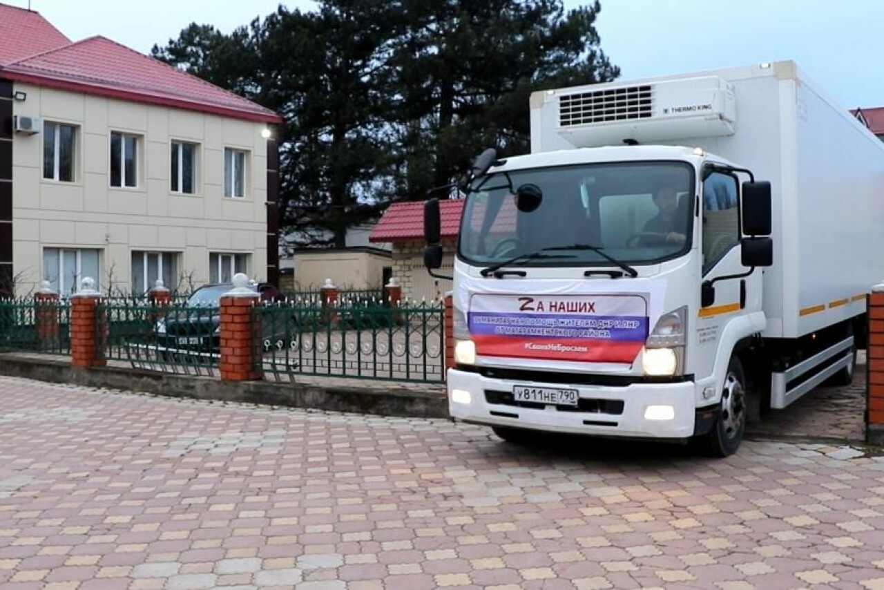 Фура с надписью на приклеенном баннере «Za_наших. Гуманитарная помощь жителям ДНР и ЛНР от Магарамкентского района. #СвоихНебросаем» выехала в столицу республики, Махачкалу, где обозначено место сбора гуманитарной помощи от Дагестана для её последующей отправки по месту назначения.