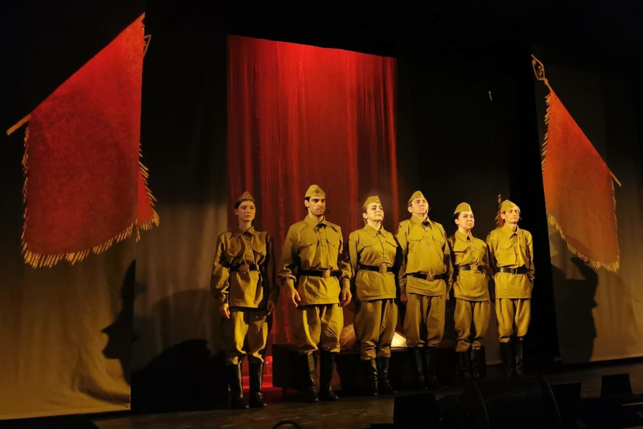 Ключевым элементом сценографии стали динамичные полотна, на которые проецировались архивные плакаты военных лет. А музыкальное оформление погружало в эпоху, где смех и слезы шли рука об руку.