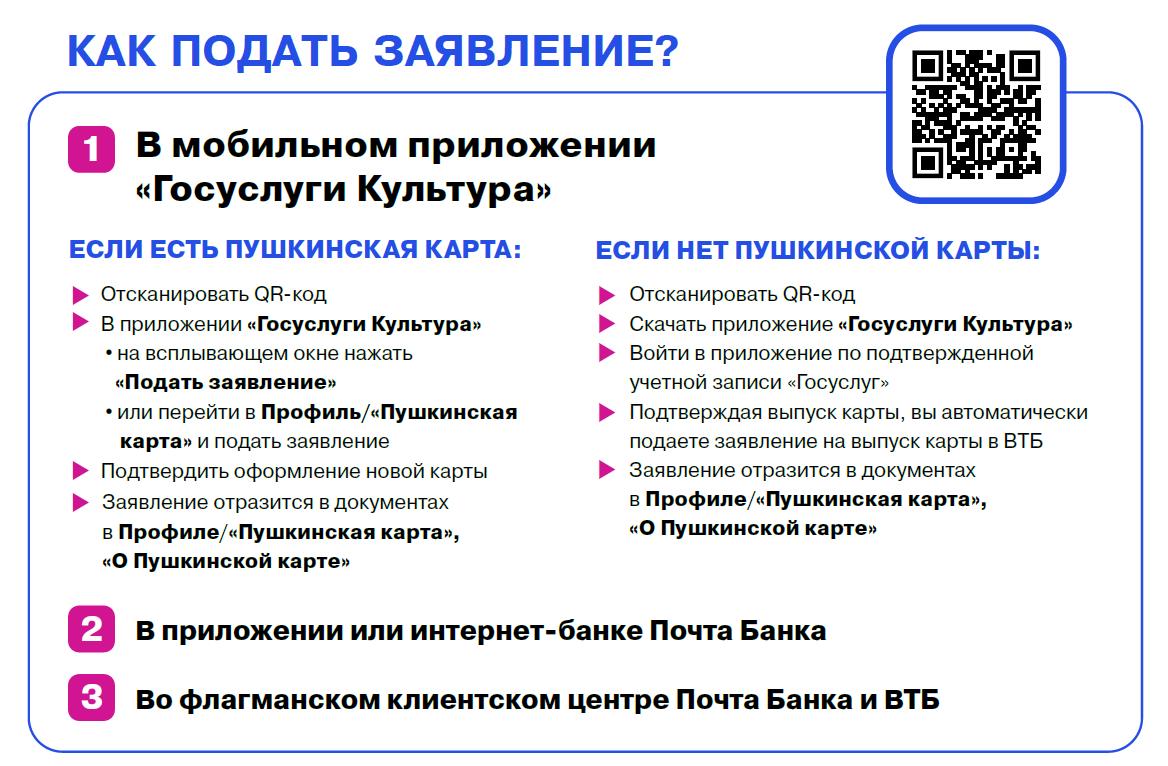 Подать заявление можно несколькими способами. Основной – через мобильное приложение «Госуслуги Культура». Владельцам действующих карт нужно в разделе «Пушкинская карта» нажать «Подать заявление». Тем, у кого карты еще нет, достаточно подтвердить выпуск в том же приложении – это действие автоматически считается заявкой на карту ВТБ. Альтернативные варианты – приложение или интернет-банк Почта Банка, а также флагманские клиентские центры обоих банков.