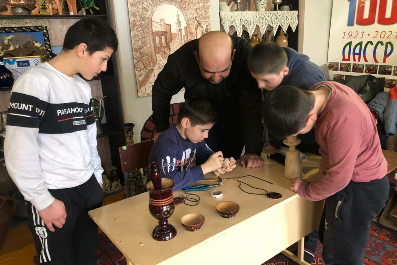 Более 20 детей со школы-интернат для детей-сирот и детей, оставшихся без попечения родителей приняли участие в мастер-классе по унцукульской насечке по дереву.