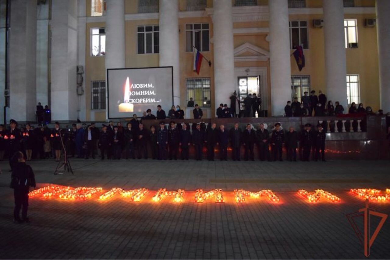 Затем перед зданием МВД из свечей было выложено слово «Помним и скорбим», после чего собравшиеся возложили цветы к мемориалу погибшим сотрудникам органов внутренних дел республики и почтили их память минутой молчания.