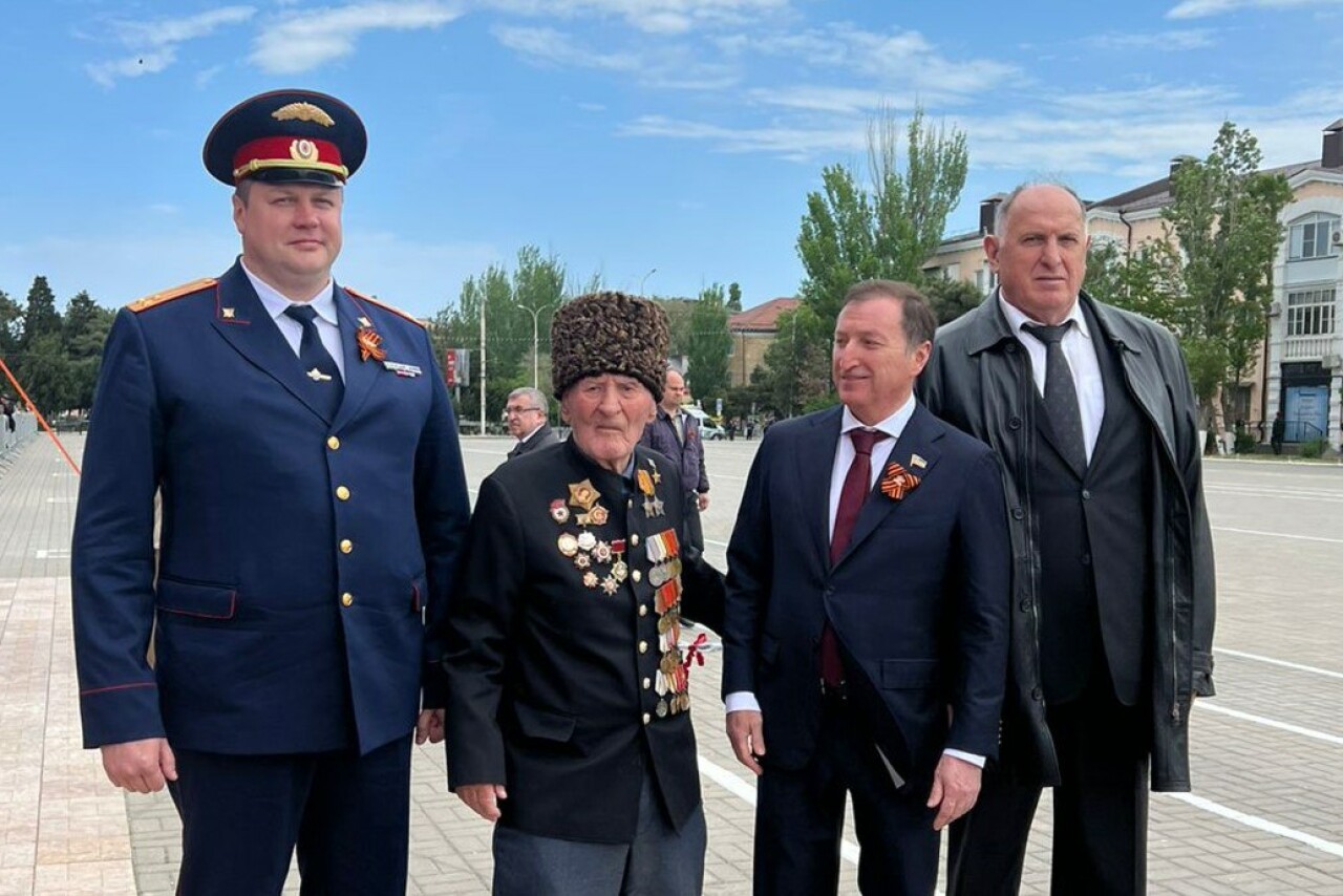 Сидящие на трибуне гости приветствовали самого почетного участника парада Победы в Каспийске командира танкового десанта, кавалера ордена Славы двух степеней и ордена Красного Знамени, гвардии сержанта Ибрагим-Пашу Садыкова. В этом году Ибрагим-Паше исполнилось 99 лет.