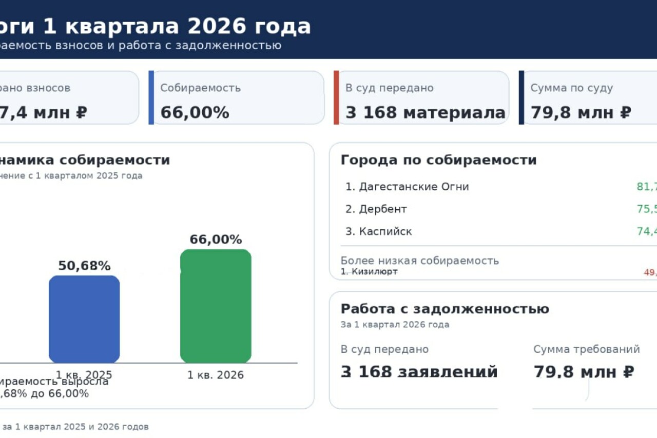 По итогам первого квартала 2026 года в Дагестане на капремонт многоквартирных домов начислено 359,7 млн рублей, а на счета Фонда поступило 237,4 млн рублей. Общая собираемость составила 66% — против 50,68% за аналогичный период прошлого года.