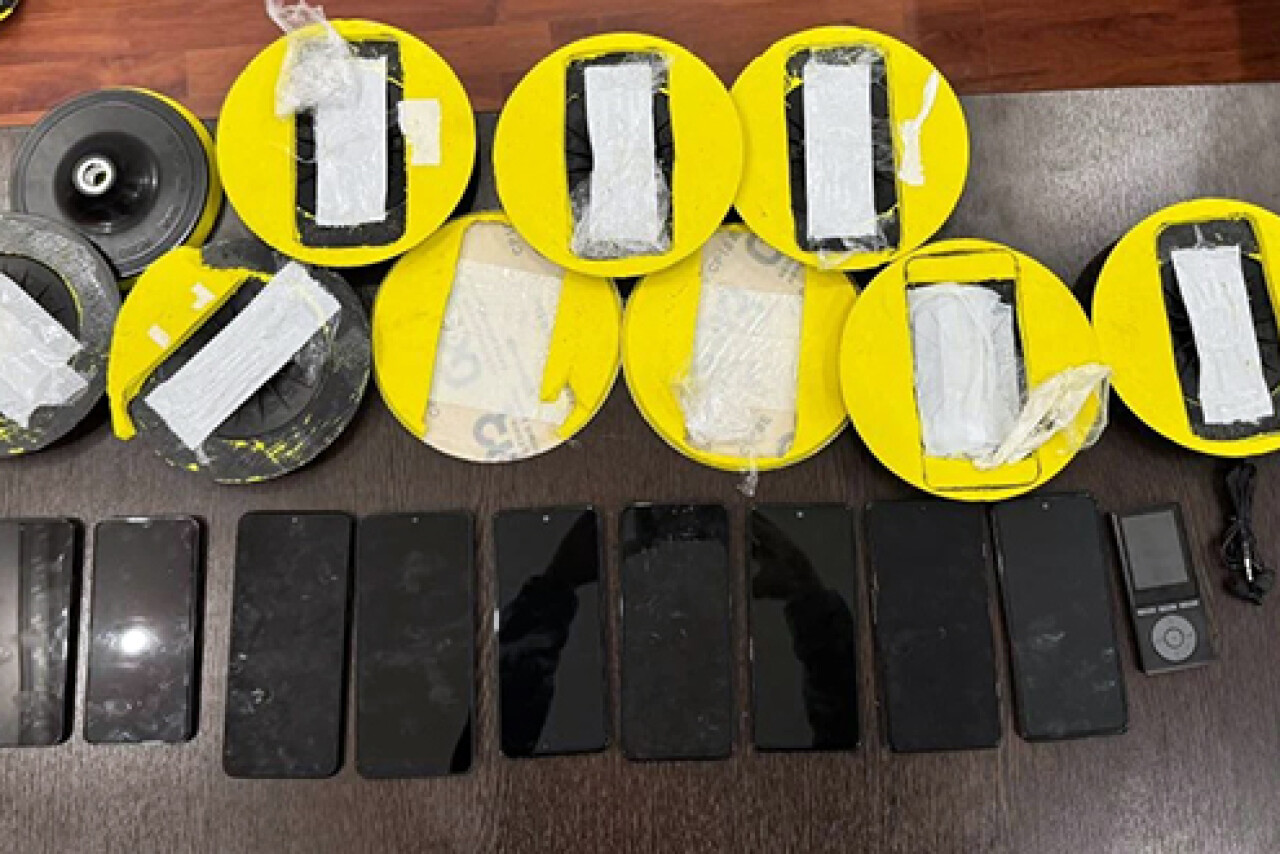 В ходе осмотра транспортного средства были найдены скрытые устройства связи: девять мобильных телефонов, аудиоплеер и проводные наушники. Эти предметы находились в хитро замаскированной полости опорных тарелок углошлифовальных машин.