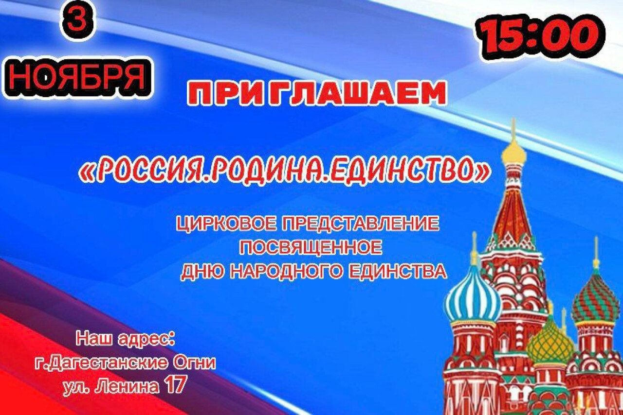 Жителей и гостей города Дагестанские Огни яркий концерт, приуроченный ко Дню народного единства. Цирковое представление под названием «Россия.Родина.Единство» состоится 3 ноября в 15:00 по адресу Ленина, 17