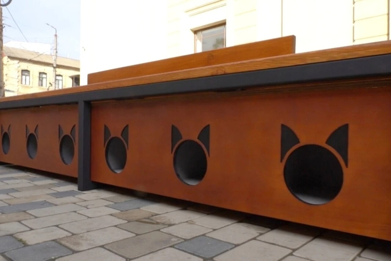 Конструкция представляет собой комбинированное сооружение — скамью со встроенными под ней шестью изолированными и утепленными «квартирами» для кошек. Каждое отделение способно вместить двух-трех животных, обеспечивая им защиту от непогоды.