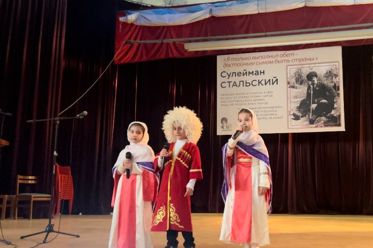 Зрителям продемонстрировали флешмоб с участием учителей Целегюской СОШ. Педагоги, воспитанники и учащиеся выступили с яркой концертной программой: прозвучали песни на стихи Сулеймана Стальского, презентованы театрализованные постановки о жизни и творчестве поэта.