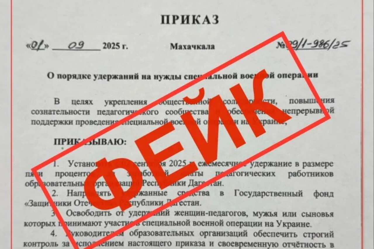 В связи с распространением ложных сведений о фальшивом приказе, регламентирующем порядок указанных в фейке отчислений на нужды специальной военной операции, в Минобрнауки Дагестана выступили с опровержением.