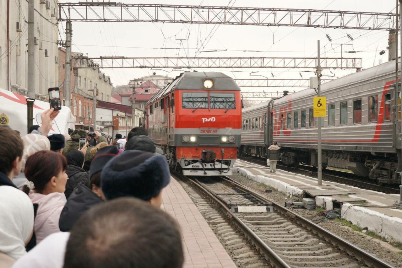 Тематический поезд встречали вице-премьер Муслим Телякавов, глава Минмолодежи региона Камил Саидов, военный комиссар РД Даитбек Мустафаев и др.
