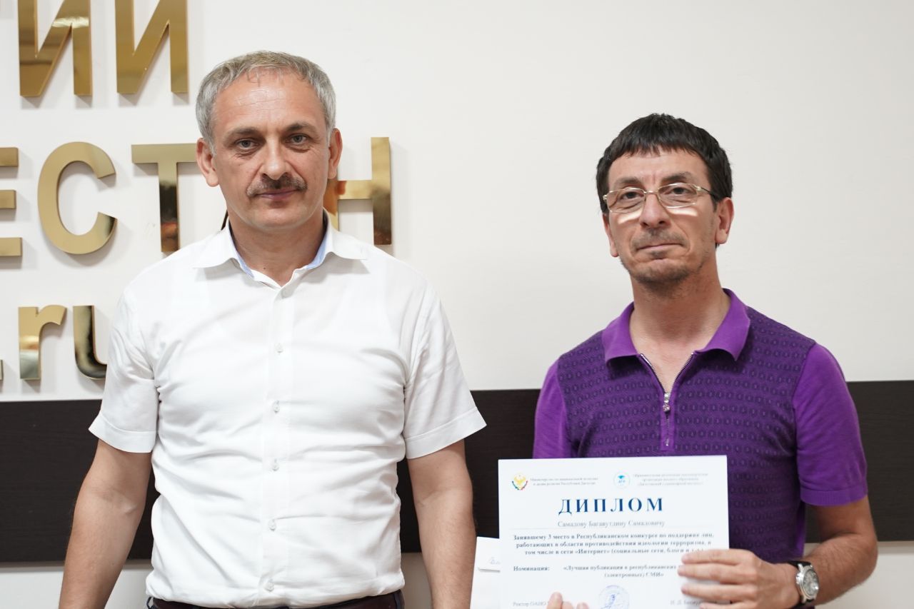 Нам вдвойне приятно отметить, что в номинации «Лучшая публикация в республиканских печатных (электронных) СМИ» начальник отдела пресс-службы МР «Карабудахкентский район», журналист, поэт, член Союза журналистов и Союза писателей Багавутдин Самадов со статьей «Отстоял Родину – потерял зрение» занял 3 призовое место.