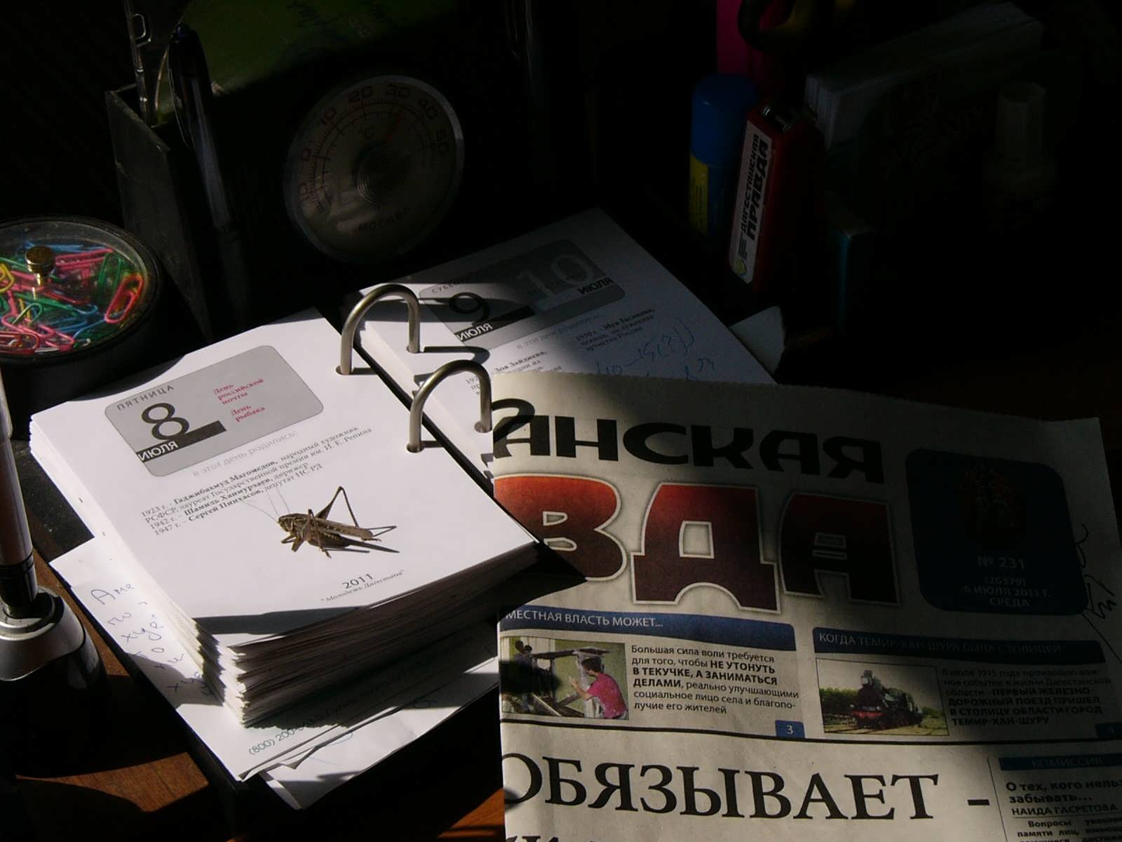 … Вот видите, пару лет назад саранча залетела даже на мой рабочий стол в редакции. Сначала я сфотографировал, а потом провел «спецоперацию» по ликвидации. И то дело: я никого не звал в гости!