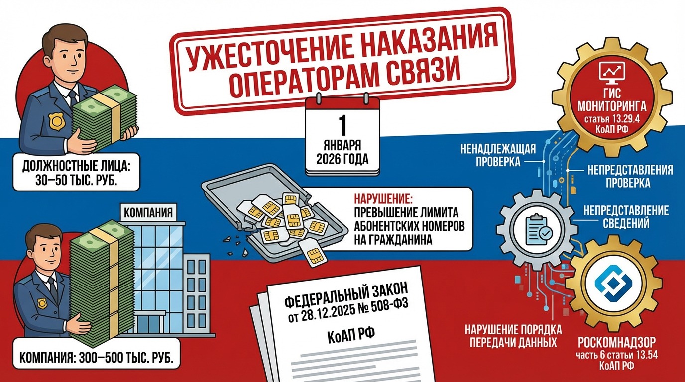 За оказание услуг с нарушением требования к количеству абонентских номеров на одного гражданина должностных лиц с 1 января 2026 года накажут на сумму от 30 тыс. до 50 тыс. руб., а компанию – от 300 тыс. до 500 тыс. руб.