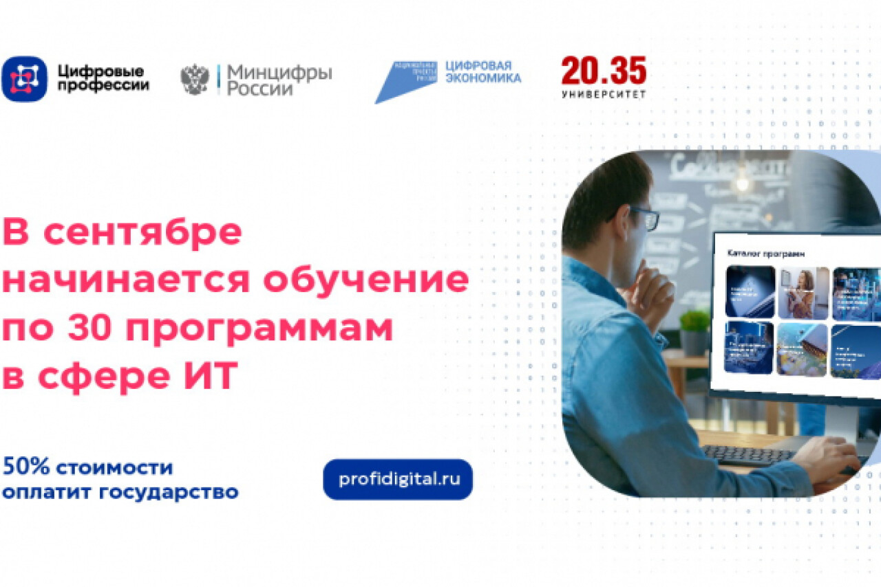 Минцифры России сообщает, что в сентябре начинается обучение по 29 новым программам проекта «Цифровые профессии». Проект является частью национальной программы «Цифровая экономика» и позволяет получить ИТ-образование за половину стоимости.